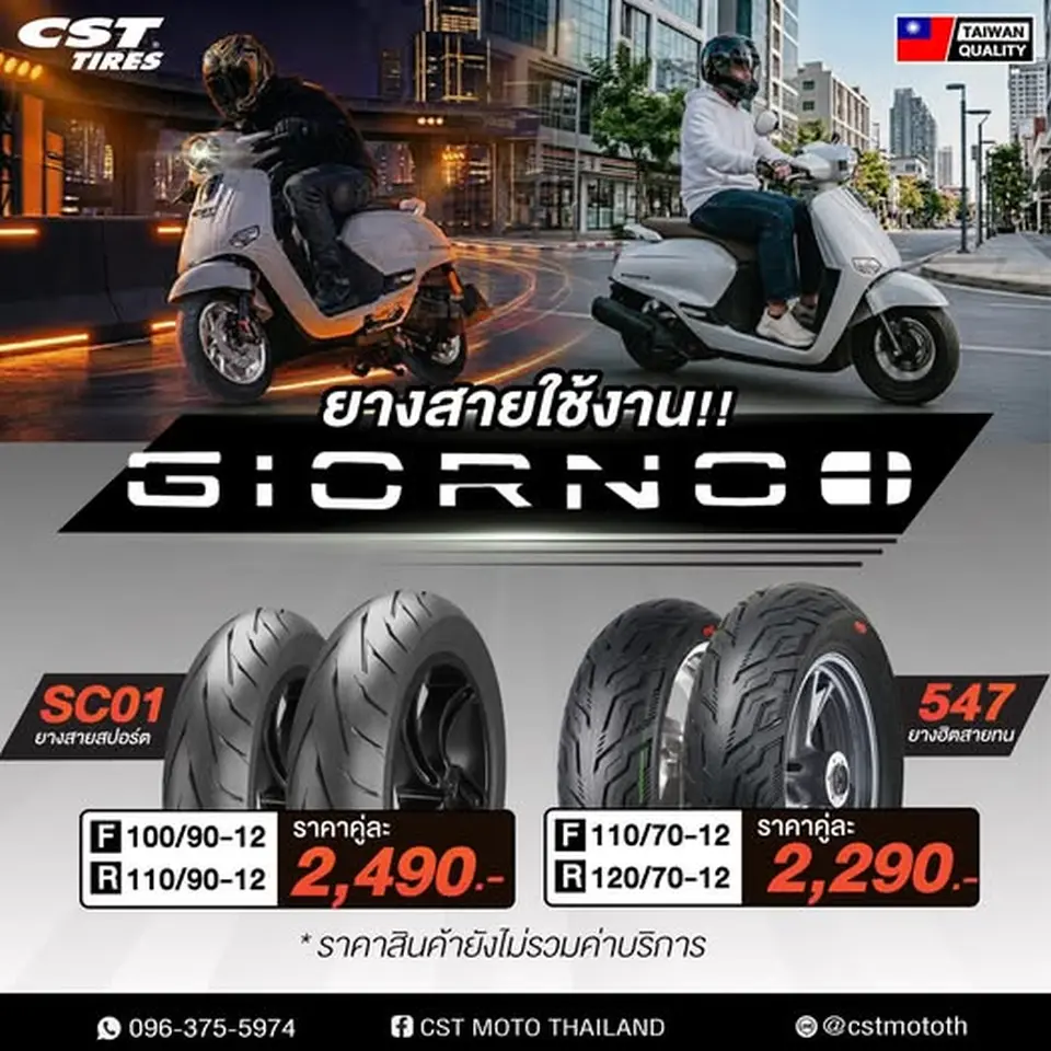 รุ่น SC01 : Sport โฉบเฉี่ยว โดดเด่นไม่เหมือนใครขนาดยาง F 100/90-12 + R 110/90-12 คู่ละ 2,490.-.รุ่น CM-547 : อเนกประสงค์ ใช้งาน รีดน้ำดีขนาดยาง F 110/70-12 + R 120/70-12 คู่ละ 2,290.-