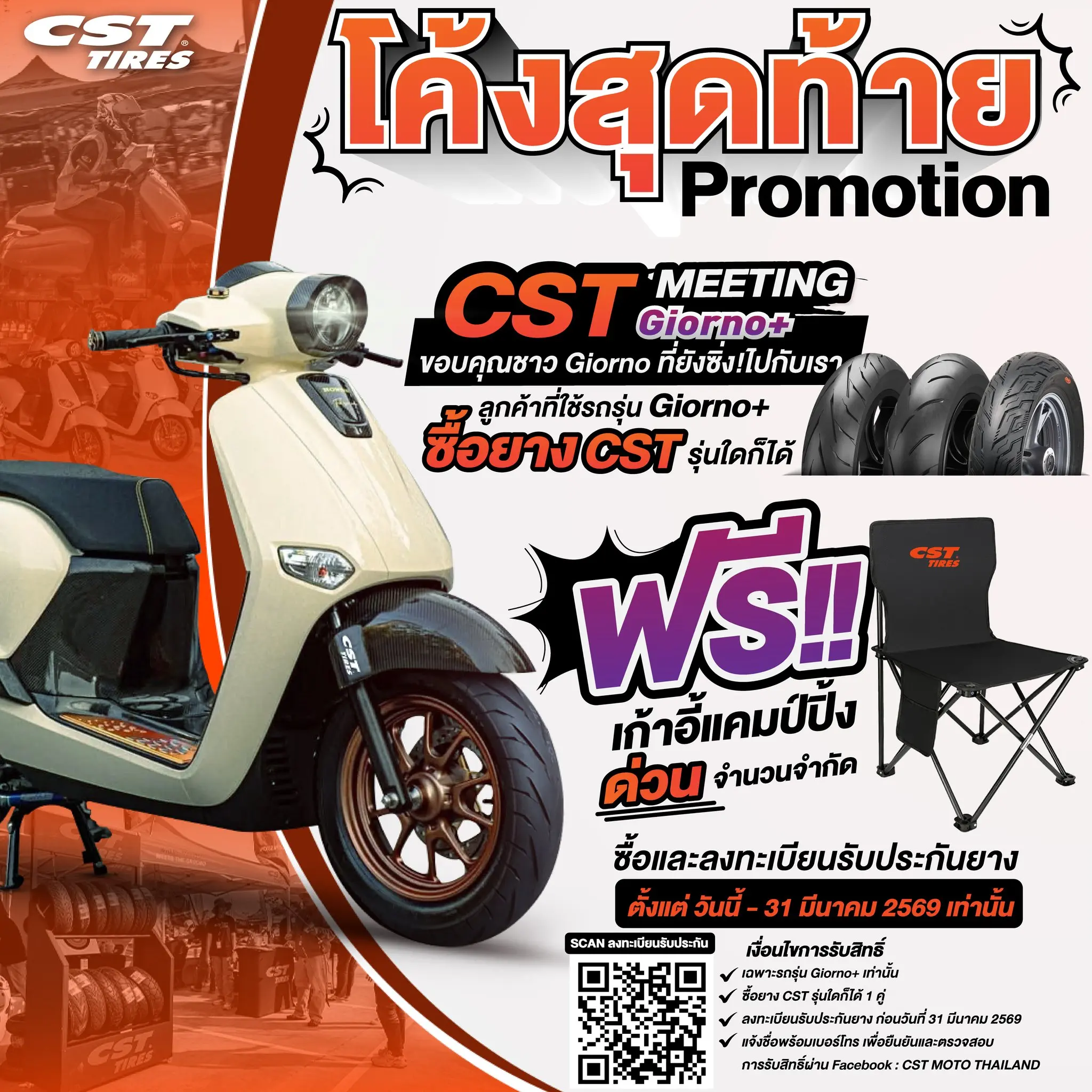 เพียงซื้อยาง CST รุ่นใดก็ได้ 1 คู่ และลงทะเบียนรับประกันยาง รับไปเลย “เก้าอี้แคมป์ปิ้ง CST” สุดลิมิเต็ด!